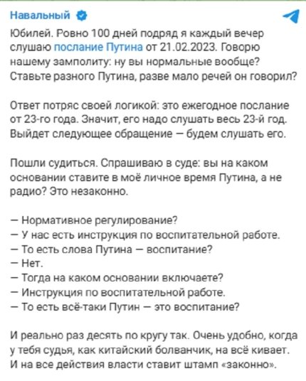 Юбилей. Ровно 100 дней подряд я каждый вечер слушаю послание Путина от 21.02.2023. Говорю нашему замполиту: ну вы нормальные вообще? Ставьте разного Путина, разве мало речей он говорил? Ответ поразил своей логикой: это ежегодное послание от 23-го года. Следовательно, его нужно слушать весь 23-й год. Выйдет следующее обращение – будем слушать его, – рассказывает российский оппозиционер.