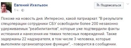 Журналист и путешественник Евгений Ихельзон считает, что это - новость дня, его также интересует, к какому патриархату относится храм, в котором держали "реабилитантов".