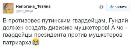 "Пусть Гундяев своих титушек в мушкетеров переименует. И будут гвардейцы царя и мушкетеры патриарха", - написал Аркадий Бабченко.