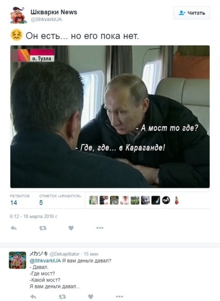 "Путин осмотрел стройку Керченского моста с вертолета. Вертолет кружил на одном месте, пока у Владимира Владимировича не закружилась голова", - смеется автор аккаунта Мысли Перзидента.