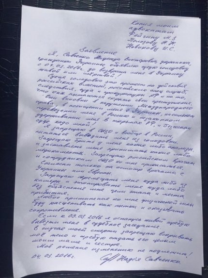 «Единственное условие и требование Надежды Савченко по прекращению сухой голодовки — немедленное возвращение в Украину», — подчеркнул он.