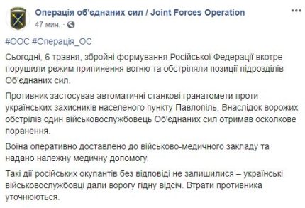 "Противник применил автоматические станковые гранатометы против украинских защитников населенного пункта Павлополь. Вследствие вражеских обстрелов один военнослужащий Объединенных сил получил осколочное ранение. Воина оперативно доставлены в военно-медицинское учреждение и оказали надлежащую медицинскую помощь", - отметил штаб.