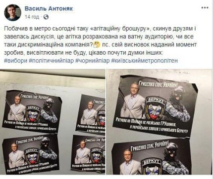 Активист Василь Антоняк заметил в Киевском метрополитене политическую рекламу «Гриценко спас Украину. Спасал на Майдане не российских ГРУшників, а украинских ребят из крымского Беркута». Об этом сообщает ONLINE.UA со ссылкой на «Вести».