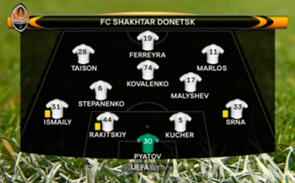 Шахтер: 30. Пятов, 33. Срна (к), 5. Кучер, 44. Ракицкий, 31. Исмаили, 6. Степаненко, 17. Малышев, 11. Марлос (22. Эдуардо, 90+1'), 74. Коваленко (18. Ордец, 88'), 28. Тайсон (9. Дентиньо, 83'), 19. Феррейра