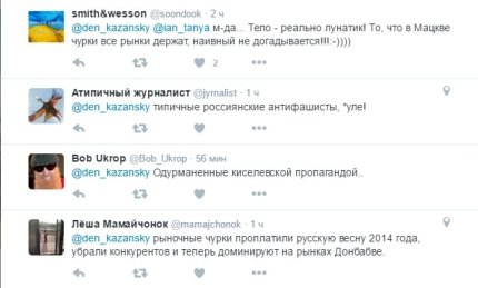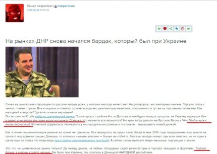 "Донецкие антифашисты снова в ударе. Не для того бандеровцев пргоняли, чтобы "чурки" торговали на рынках", - написал Казанский и обнародовал скриншот блога одного из фанатов ДНР, озаглавленный "На рынках ДНР снова начался бардак, который был при Украине".
