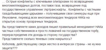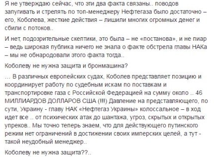 "Это было 24 ноября 2015 года, в самый разгар нашей с Коболевым борьбы с Osthemom Фирташа за возврат государству трех миллиардов гривень, в момент ареста имущества должников – дом, в котором живет Коболев с семьей был обстрелян несколькими автоматными очередями, в момент когда Андрей выезжал на работу. На следующий день – мы вынуждены были выделить Андрею спец охрану, а премьер-министр Яценюк отдал Коболеву свой штатный бронеавтомобиль, обязав его перемещаться на нем. Эпизод, но деньги для государства, в итоге, мы получили – три миллиарда оказались важнейшим подспорьем в закупке газа для зимне-весеннего периода - благодаря сверхжесткой позиции Коболева и действиям Нацполиции", - отметил министр.