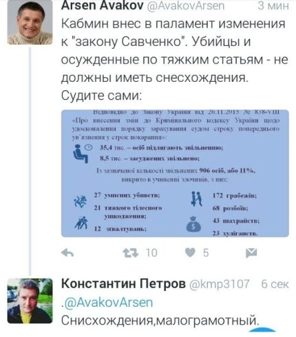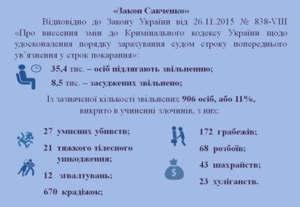 "Кабмин внес в парламент изменения к "закону Савченко". Убийцы, насильники и другие преступники, осужденные по тяжким статьям криминального кодекса - не должны иметь никакого снисхождения. Судите сами", - написал Аваков, опубликовав инфографику.