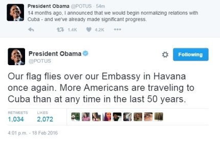 «14 месяцев назад, я объявил, что мы начнем нормализацию отношений с Кубой - и мы уже достигли значительного прогресса. Наш флаг вновь развевается над нашим посольством в Гаване. Больше американцев ездит на Кубу, чем в любое время за последние 50 лет», - сообщил Обама.