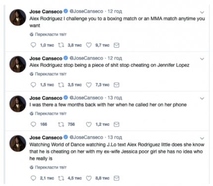 Узнав о помолвке, Хосе Кансеко сделал на своей странице в Twitter несколько сообщений, в которых сообщил, что Алекс подло обманывает Джей Ло.