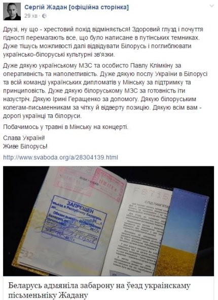 Также писатель поблагодарил украинских дипломатов за настойчивость в выяснении обстоятельств выдворения его из Беларуси. "Спасибо всем вам - дорогие Украинцы и белорусы. Увидимся в мае в Минске на концерте. Слава Украине! Жыве Беларусь!", - добавил он.