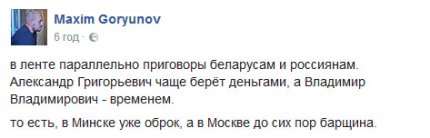 "В ленте параллельно приговоры беларусам и россиянам. Александр Григорьевич чаще берёт деньгами, а Владимир Владимирович - временем. То есть, в Минске уже оброк, а в Москве до сих пор барщина", - написал Горюнов, намекнув, что в России задержанным дают в основном аресты на 15 суток, тогда как в Минске "выписывают" штрафы.