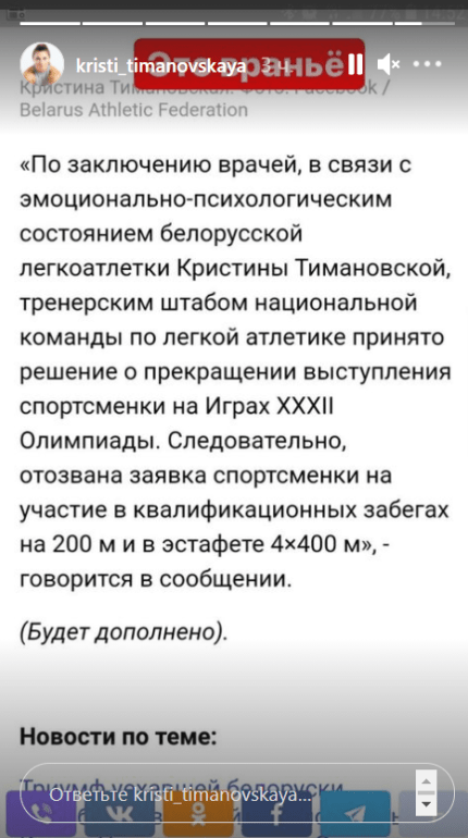 Кристина Тимановская должна была выступать на Олимпиаде на дистанциях 100 и 200 м. Но руководство нацсборной решило включить бегунью еще и в эстафету 4*400 м, поскольку двое легкоатлеток отсранили от этой дистанции из-за отсутствия необходимого количества допинг-проб. Девушка раскритиковала это решение в соцсетях.