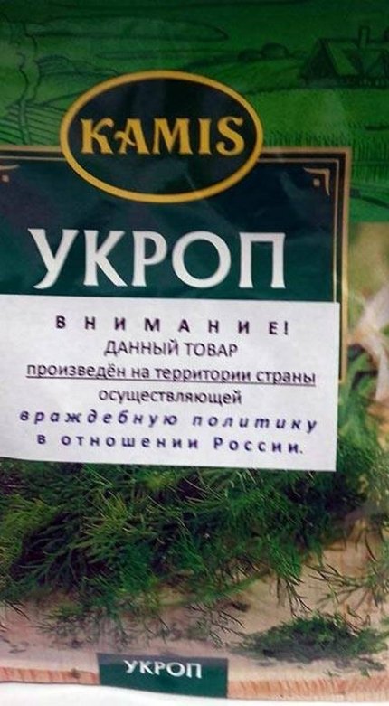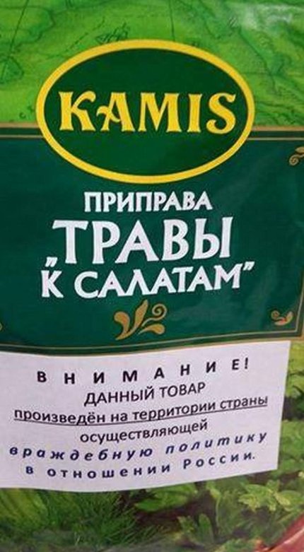 Так, в сети появились фото приправ: укропа и набора трав к салату, изготовленных в Польше. При этом, на каждой из упаковок приклеена надпись: "Внимание! Данный товар произведен на территории страны, осуществляющей враждебную политику в отношении России".