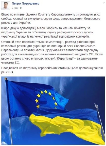 Президент Украины Петр Порошенко после голосования в профильном комитете Европарламента в поддержку введения безвизового режима для Украины рассказал о следующих шагах Евросоюза.