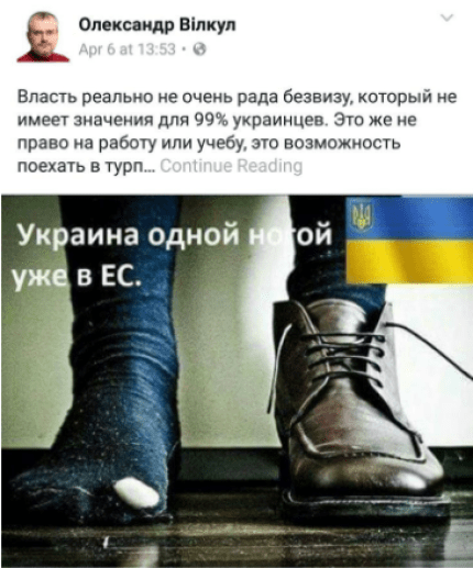 "Самое смешное и одновременно грустное в этом всём, что Вилкул – член Комитета ВРУ по вопросам европейской интеграции! Да, Карл, нардеп, отвечающий за евроинтеграцию, когда его страна получает безвиз, первым делом выкладывает картинку с дырявыми носками! Ой, сорри - с одним дырявым носком!" – отметил Черняк.