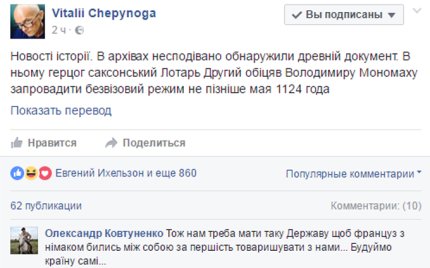 «Новости истории. В архивах неожиданно обнаружили древний документ. В нем герцог саксонский Лотарь Второй обещал Владимиру Мономаху ввести безвизовый режим не позднее мая 1124 года», - пошутил Чепинога.