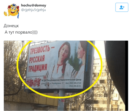 Пользователь опубликовал снимок билборда на одной из донецких улиц, где были изображены девушки в традиционных русских сарафанах с надписью "Трезвость – русская традиция".
