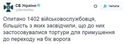 Украинская спецслужба опросила 1402 военнослужащих из зоны АТО, вернувшихся из плена террористов. При этом, большинство из них признались, что к ним в плену были применены пытки для принуждения перехода военных на сторону пророссийских боевиков.