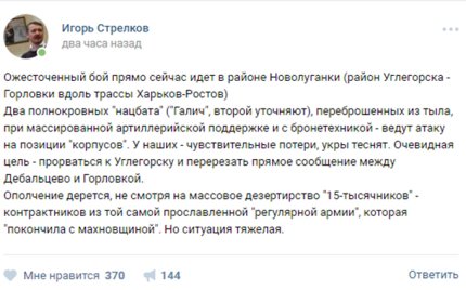 «Ополчение дерется, несмотря на массовое дезертирство "15-тысячников" - контрактников из той самой прославленной "регулярной армии", которая "покончила с махновщиной". Но ситуация тяжелая», - добавил Стрелков.