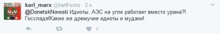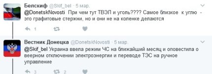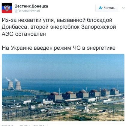 Так, в Twitter-аккаунте Вестник Донецка появилось сообщение о том, что "из-за нехватки угля, вызванной блокадой Донбасса, второй энергоблок Запорожской АЭС остановлен", а по всей территории Украины "введен режим чрезвычайной ситуации" в энергетике.