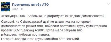 Боевики так называемой ДНР в районе Светлодарской дуги обстреляли группу гуманитарного проекта Вооруженных сил Украины "Эвакуация-200".