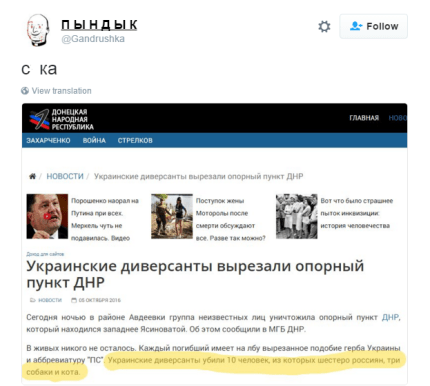 "В живых никого не осталось. Каждый погибший имеет на лбу вырезанное подобие герба Украины и аббревиатуру "ПС". Украинские диверсанты убили 10 человек, из которых шестеро россиян, три собаки и кота. Расположенная в 400 метрах группа поддержки и прикрытия не слышала звуков выстрелов, что говорит про применение бесшумного натовского оружия, поставленного украинскому режиму американцами", - говорится в сообщении так называемого "МГБ ДНР".