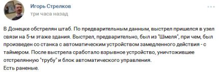 "В Донецке обстрелян штаб. По предварительным данным, выстрел пришелся в узел связи на 5-м этаже здания. Выстрел, предварительно, был из "Шмеля", причем был произведен со станка с автоматическим устройством замедленного действия - с таймером. После выстрела сработало взрывное устройство, уничтожившее отстрелянную "трубу" и блок автоматического управления. Есть раненые", - написал он.