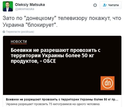 В соцсетях проиронизировали над ситуацией. Так, журналист Алексей Мацука написал: "Зато по "донецкому" телевизору покажут, что Украина "блокирует".