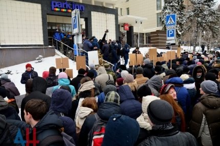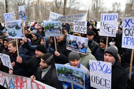 Митинг прошел у гостиницы "Park Inn" на бульваре Пушкина, где находится офис миссии ОБСЕ. При этом примечательно, что обнародованные фотографии с места события сняты из толпы, и ни на одной из них не запечатлен общий план, из чего можно сделать вывод, что на мероприятие пришло меньше заявленного количества людей.