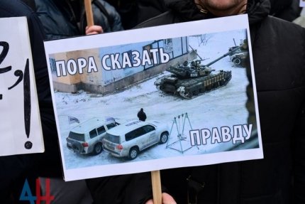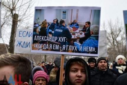 На фото видно, что участники митинга выступили с плакатами «ОБСЕ, открой глаза», «Хуг – агент Киева», «Хуг, скажи правду».