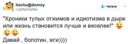 "Хроники тупых отжимов и идиотизма в дыре или жизнь становится лучше и веселее!" Давай , болотин, жги", - написали на странице в Twitter сообщества Hochu_domoy.