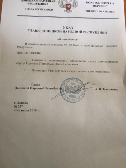 Приходько в Facebook опубликовал «указ» главаря так называемой ДНР Александра Захарченко о своем назначении. В «документе» указано, что Приходько назначен на должность неделю назад - 14 июля.