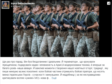 "Еще раз о параде. Он был безупречным и идеальным...Единственное, чего не хватало – это особого акцента, что впервые шагал по Крещатику и сводный отряд женщин-военных. Цифра в информационном тексте, что уже 25 тысяч украинок служат по контракту в ВСУ, из них более 3000 офицеров. Страна должна знать, сколько у нас женщин-подполковников и полковников, потому что они служат наравне с мужчинами", - написала Геращенко.
