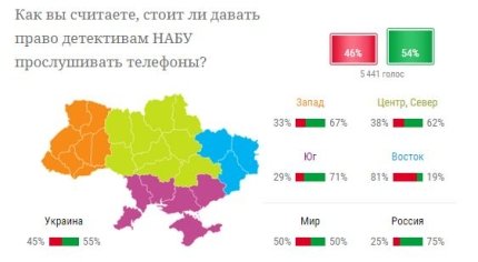 Редакция ONLINE.UA спросила у украинцев, считают ли они необходимым предоставить право детективам НАБУ прослушивать телефоны. Согласно полученным результатам, больше половины украинцев (55%) не против такой инициативы. 45% жителей страны считают, что это будет ограничивать права человека. В частности, 81% жителей восточного региона Украины согласны с президентом, и выступили против предоставления права НАБУ снимать информацию с каналов связи.
