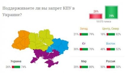 Согласно результатам опроса. большинство граждан Украины (74%) поддерживают запрет Компартии, против выступило 26% респондентов. Больше всего одобряют запрет в центре, на севере, западе и юге Украины. На востоке 48% опрошенных против того, чтобы деятельность КПУ была запрещена. В РФ же мнения разделились поровну.