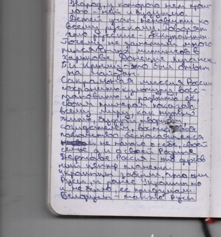 В найденной при нем записной книжке есть запись, которая хорошо иллюстрирует, почему он приехал воевать на Донбасс, и как российская пропаганда оправдывает свою агрессию в Украине: «Сакральная миссия России — сохранить культуру, восстановить и развить ее, своим примером показывая всему миру, как нужно жить, будучи творцом, воспитывать потомство, беспокоящееся не только о себе, а и о своей Родине — Державе. Россия — это духовный центр планеты». Также мужчина пишет о каком-то свете, который он для себя выбрал.