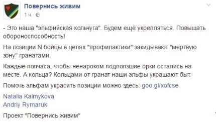 "Это наша "эльфийская кольчуга". Будем ещё укрепляться. Повышать обороноспособность! На позиции N бойцы в целях "профилактики" закидывают "мертвую зону" гранатами. Каждые полчаса, чтобы ненароком подползшие орки остались на месте. А кольца? Кольцами от гранат наши эльфы украшают быт", - написали в сообществе.