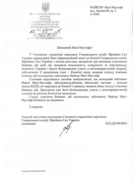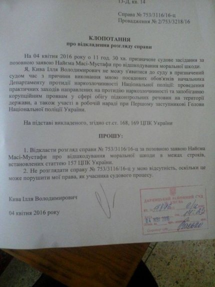 Своё заявление Маси Найем сопроводил документами о том, что он даже не просил звания участника боевых действий, а также ходатайством Ильи Кивы касательно отложения рассмотрения судебного дела о возмещении морального ущерба: