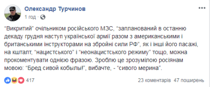 Турчинов подчеркнул, что "разоблаченный" Лавровым, "запланированное в последнюю декаду декабря, наступление украинской армии вместе с американскими и британскими инструкторами на вооруженные силы РФ", как и другие пассажи премьера РФ, вроде, "нацистского" и "неонацистского режима" он может прокомментировать одной фразой.