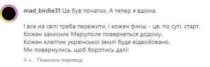 Это было начало. А теперь я дома. "І все на світі треба пережити, і кожен фініш - це, по суті, старт". Каждый защитник Мариуполя вернется домой. Каждый клочок украинской земли будет отвоеван. Мы вернулись, чтобы бороться дальше! – написала "Пташка" на своей странице в instagram и добавила фото на фоне украинского флага.
