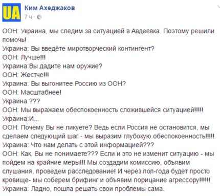 «ООН: Как, Вы не понимаете??? Если и это не изменит ситуацию - мы пойдем на крайние меры!!! Мы создадим комиссию, объявим слушания, проведем расследование! И через полгода будет просто кровище - мы соберем брифинг и объявим порицание агрессору! Украина: Ладно, пошла решать свои проблемы сама», - иронизируют в сети.
