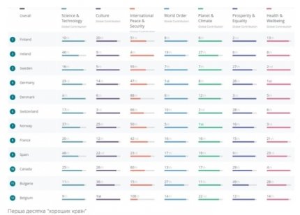Первая десятка "хороших стран" выглядит так: Финляндия, Ирландия, Швеция, Германия, Дания, Швейцария, Норвегия, Франция, Испания и Канада. Соединенные Штаты Америки занимают 40-ю строчку.