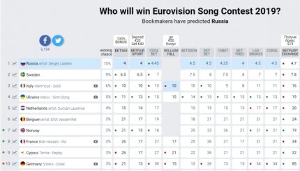 После оглашения победителя Нацотбора Украины на Евровидение 2019 букмекеры изменили прогноз на победителя международного песенного конкурса. В новом прогнозе Украину подняли на четвертую позицию, хотя до этого прогнозировали лишь 14 место для украинского исполнителя на Евровидении 2019, сообщает ONLINE.UA.