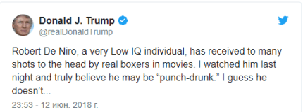 "Роберт Де Ниро, человек с низким IQ, в фильмах получил слишком много ударов в голову от боксеров... Я за этим наблюдал и уверен, что он также получил травму головы", - написал Трамп.