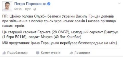 Василий Грицак, - глава Службы безопасности Украины, - доложил об освобождении из плена троих военнослужащих Вооруженных сил Украины. Были освобождены старший сержант Гарнага, младший сержант Дмитрук и солдат Макуха, - сообщил глава государства о трех освобожденных военных.