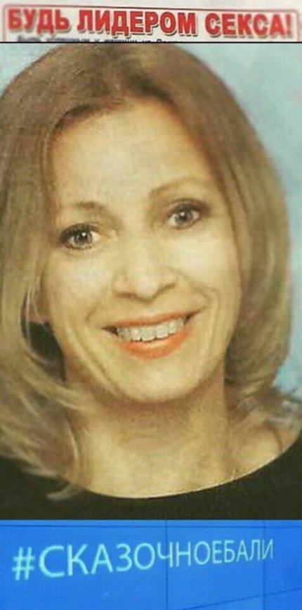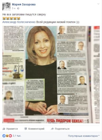 Захарова обнародовала фото полосы газеты, где под материалом о ней и ее фотографией размещена надпись "Будь лидером секса", явно относящаяся к другой статье.