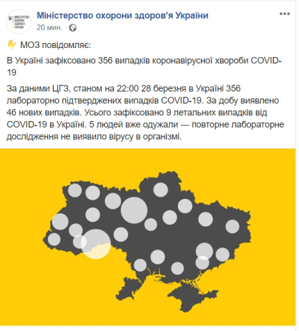 В субботу, 28, марта число заболевших коронавирусом в Украине увеличилось - по состоянию на 22:00 подтверждено 356 случаев заражения. За последние сутки было выявлено 46 новых случая. Об этом сообщает ONLINE.UA со ссылкой на пресс-службу Минздрава Украины.