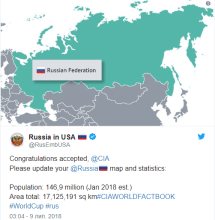 "Поздравления приняты, ЦРУ. Пожалуйста, обновите вашу карту России и статистику", - сказано в сообщении российских дипломатов.