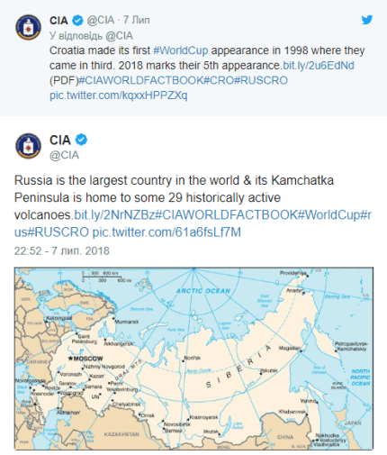 Центральное разведывательное управление США опубликовало поздравление для четвертьфиналистов Чемпионата мира по футболу, в том числе и России, прикрепив к сообщению карту с Крымом в составе Украины.