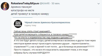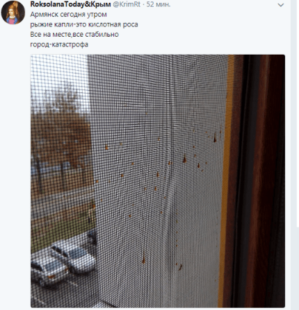 В тоже время жители Армянска паникуют из-за того, что оккупанты решили вернуть детей в "газовую камеру". Они публикуют в сети фото, как на сетках окон остается кислотная роса рыжего цвета, отмечая, что в городе все по-прежнему катастрофически плохо с экологической ситуацией.